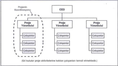 Proje bazlı organizasyonlarda Proje Yöneticilerinin Yetki ve Sorumluluk alanları oldukça geniştir. Bir şirketin proje bazlı organizasyon tipinde faaliyet göstermesi projelerin kurum içindeki önemiyle yakından ilgilidir. Eğer şirket temel kazancını proje yaparak kazanıyorsa, bu durumda doğal olarak, proje bazlı çalışmak zorunda ve organizasyonu da proje bazlı kurgulamak zorundadır.Bu organizasyon tipinde kontrol ve yönetim, proje yöneticilerinde olduğu gibi çalışanlar arasında hedef odaklı çalışma alışkanlığı doğmuştur. Buna karşılık, proje yöneticileri çok fazla idari süreçlere dahil olmak zorunda kalabilirler. Ayrıca çalışanlar da tek bir konuda uzman olmaktan uzaklaşırlar hatta her işi yapan kişiler haline dönüşebilirler.