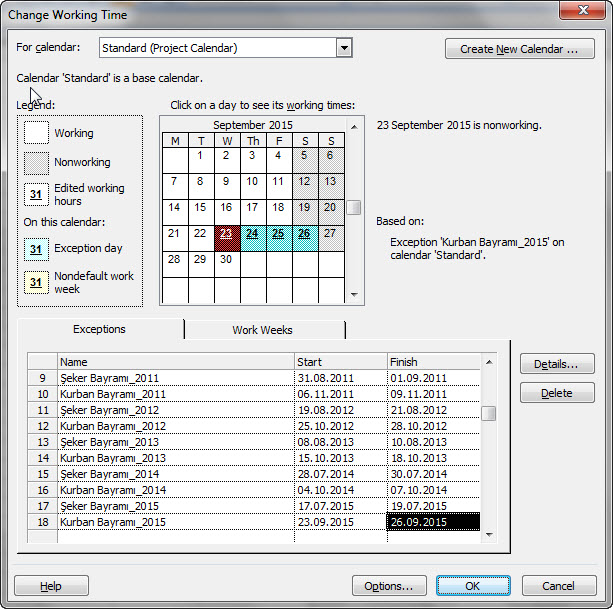 Aşağıdaki dosyada Tools-Change Working Time komutuna giderek tatil bilgilerini görebilirsiniz.