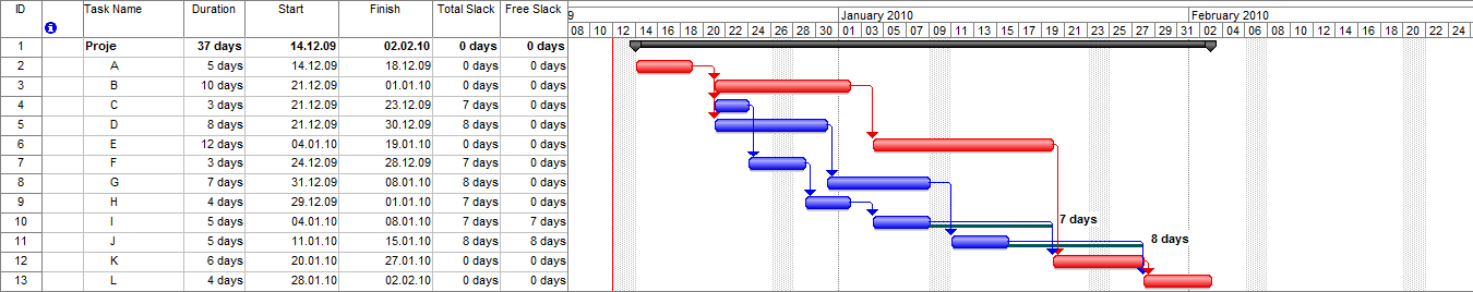 Eğer kullandığınız tabloya Total Slack ve Free Slack (Tr: Toplam Bolluk ve Serbest Bolluk) kolonlarını da eklerseniz, kritik olmayan aktivitelerin ne kadar kayabileceğine dair tüm bilgiye ulaşmış olursunuz.