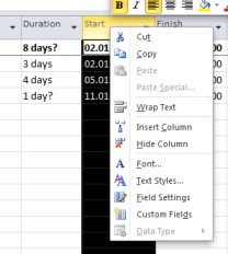 1- İçinde bulunduğum gün aktivitelerin başlangıç tarihine yaklaştıkça MS Project bize uyarıda bulunsun istiyorum. Öncelikle, bulmam gereken; Aktivitelerin başlangıç tarihleri ile içinde bulunduğum gün arasındaki farktır. Bunun için MS Project’e yeni bir kolon ekleyelim. Aşağıdaki gibi Start kolonunun üzerindeyken mouse sağ tuş yap “Insert Coloumn” işaretleyin.